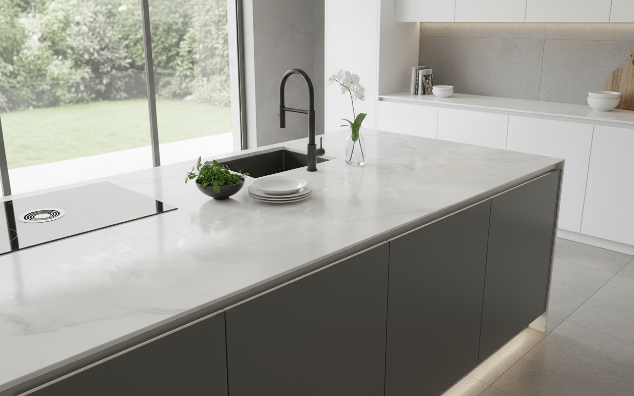 Cool white porcelain with misty grey veining for a crisp, airy aesthetic that brightens kitchens and baths.
