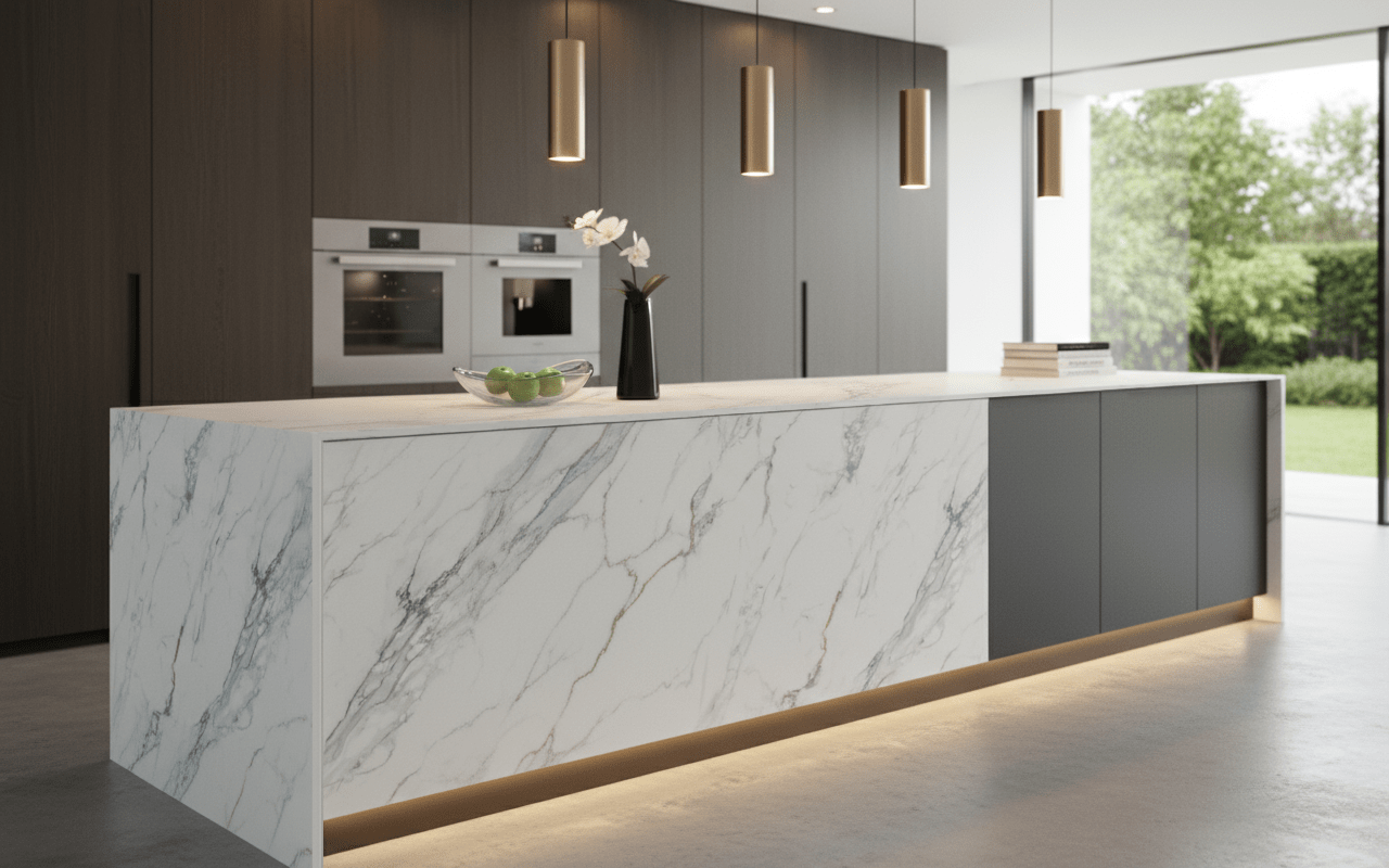 A dramatic dark base with metallic shimmer and wave-like movement — bold and striking in porcelain.
