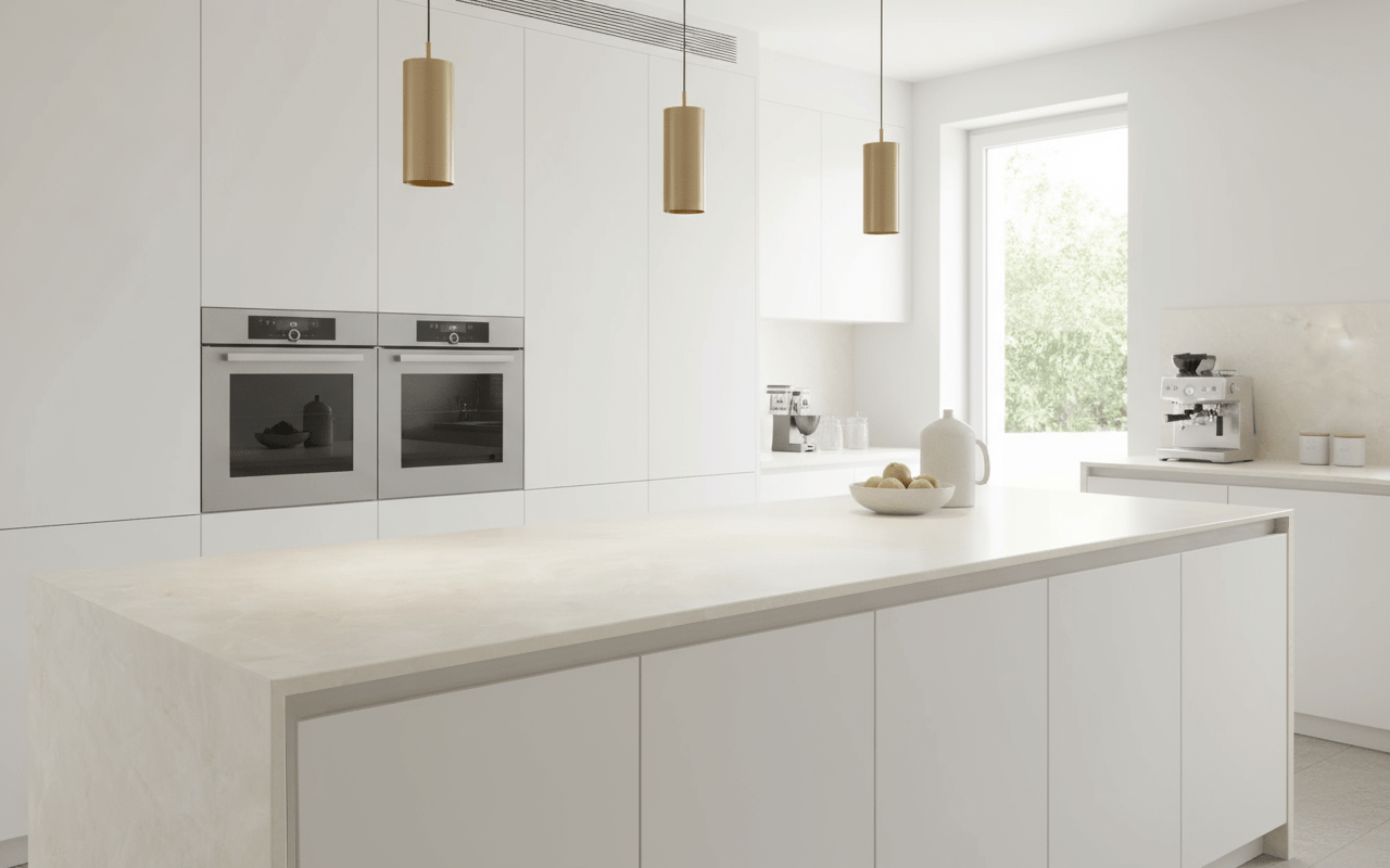 Features a soft, creamy beige background with subtle veining in warm light taupe tones. Inspired by the elegance of Taj Mahal quartzite.